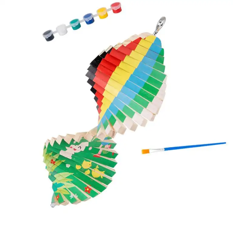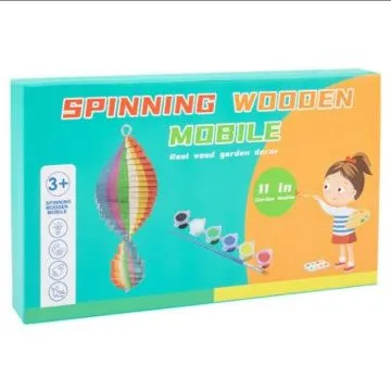 Comes with wooden pieces to assemble into a spinning mobile.