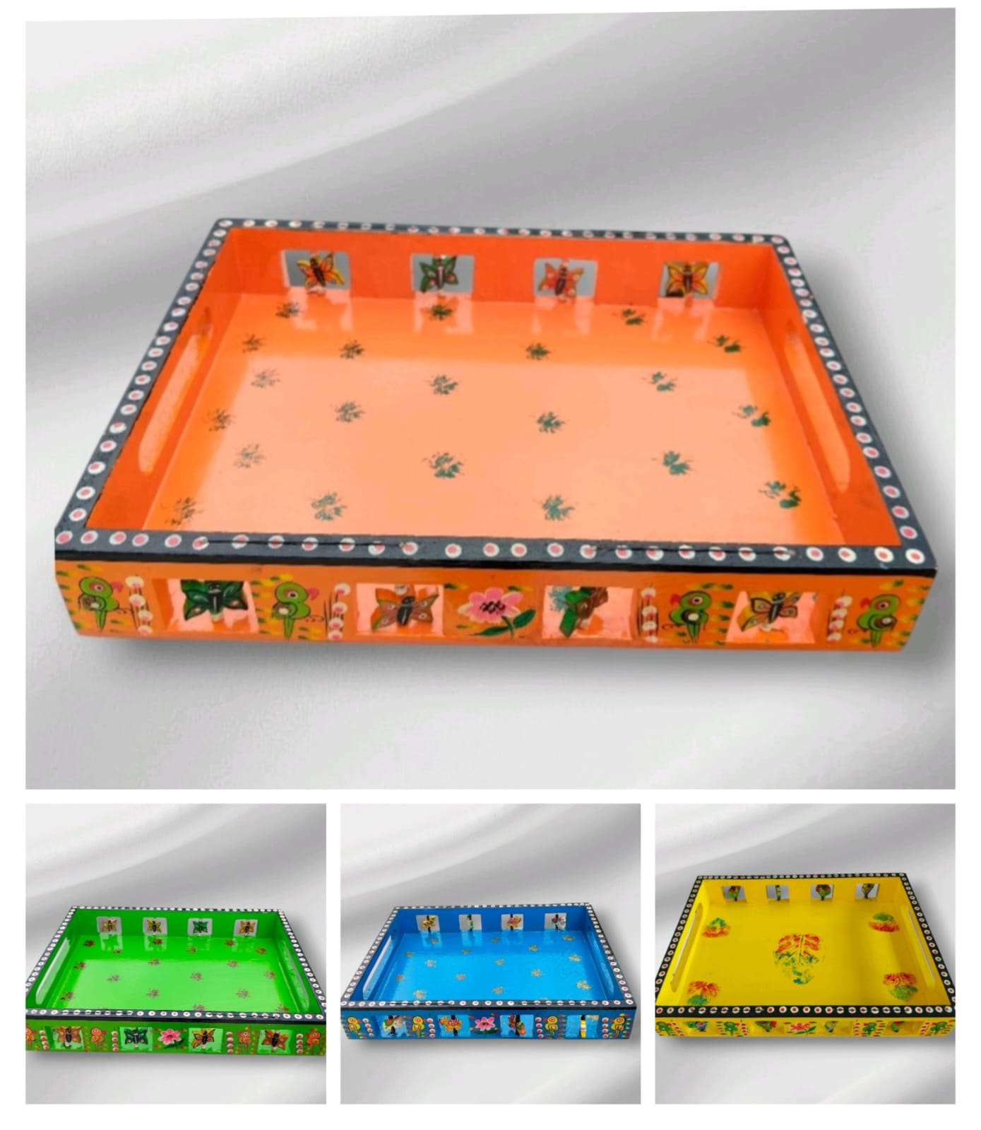 Our hand-painted wooden trays are crafted with love, featuring vibrant colors and detailed folk art designs like butterflies, flowers, and tribal motifs. Perfect for your home, office, or festive gifting. 🎨🪔