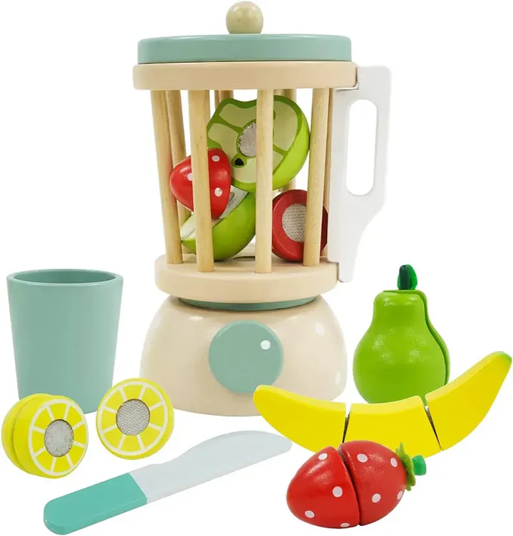 Crafted from high-quality wood and finished with non-toxic, child-safe paints, this playset ensures durability and safety for endless hours of fun. The lifelike design of the fruits, complete with velcro fasteners, provides a satisfying "cutting" sound when sliced, enhancing the immersive experience. This interactive play encourages fine motor skills, hand-eye coordination, and creative thinking as kids practice juicing their favourite fruits.