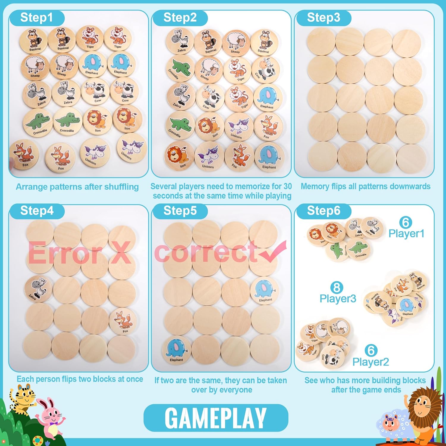 Multiple Game Modes for All Ages: Players can flip the cards face up, shout the animal names, and race to find pairs. This practice helps kids hand-eye coordination. Or play memory games by flipping cards face down and recalling matches after 30 seconds. You can make game rules to suit your child’s age and skill level, ensuring a fun and challenging experience.