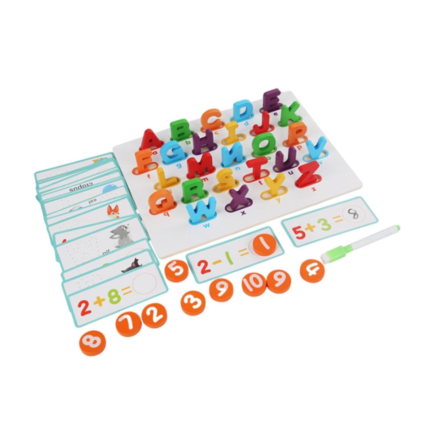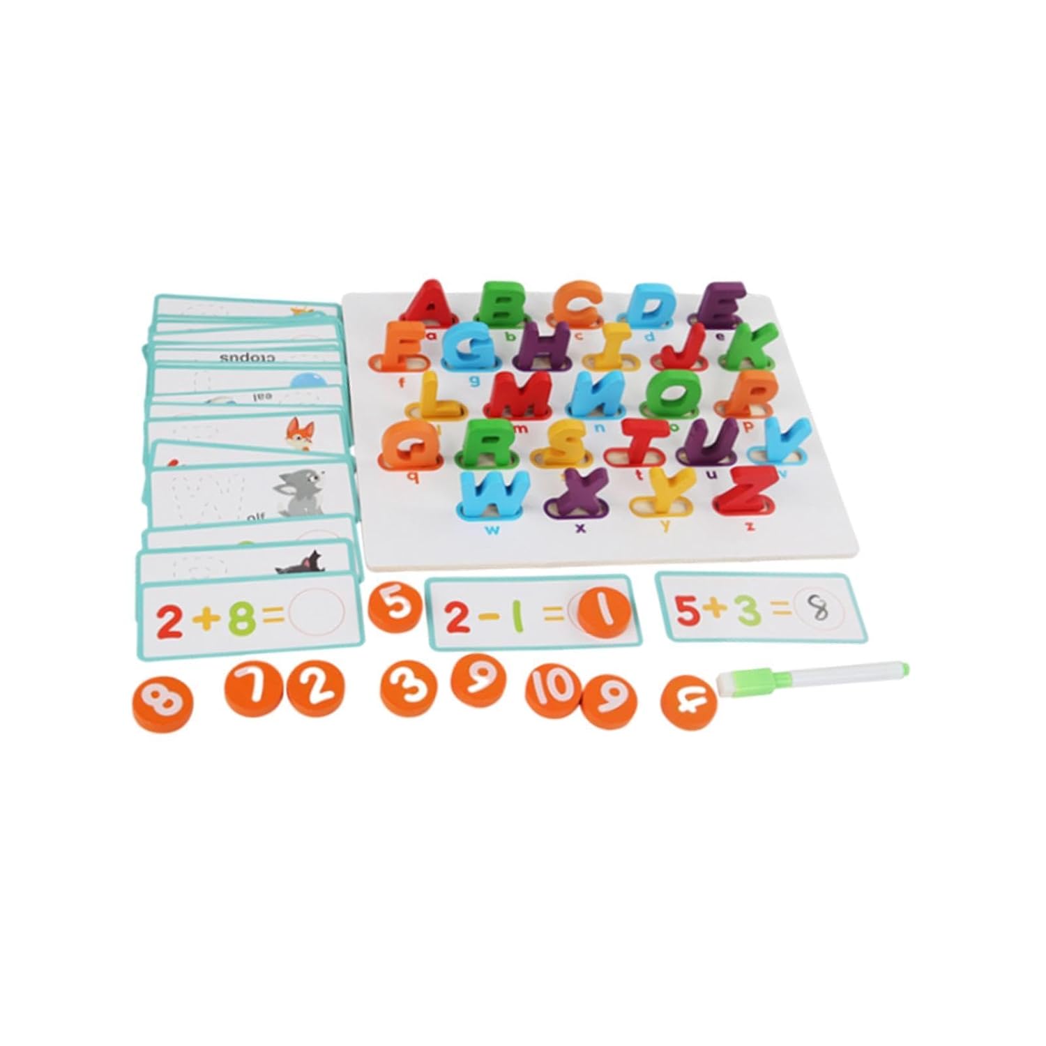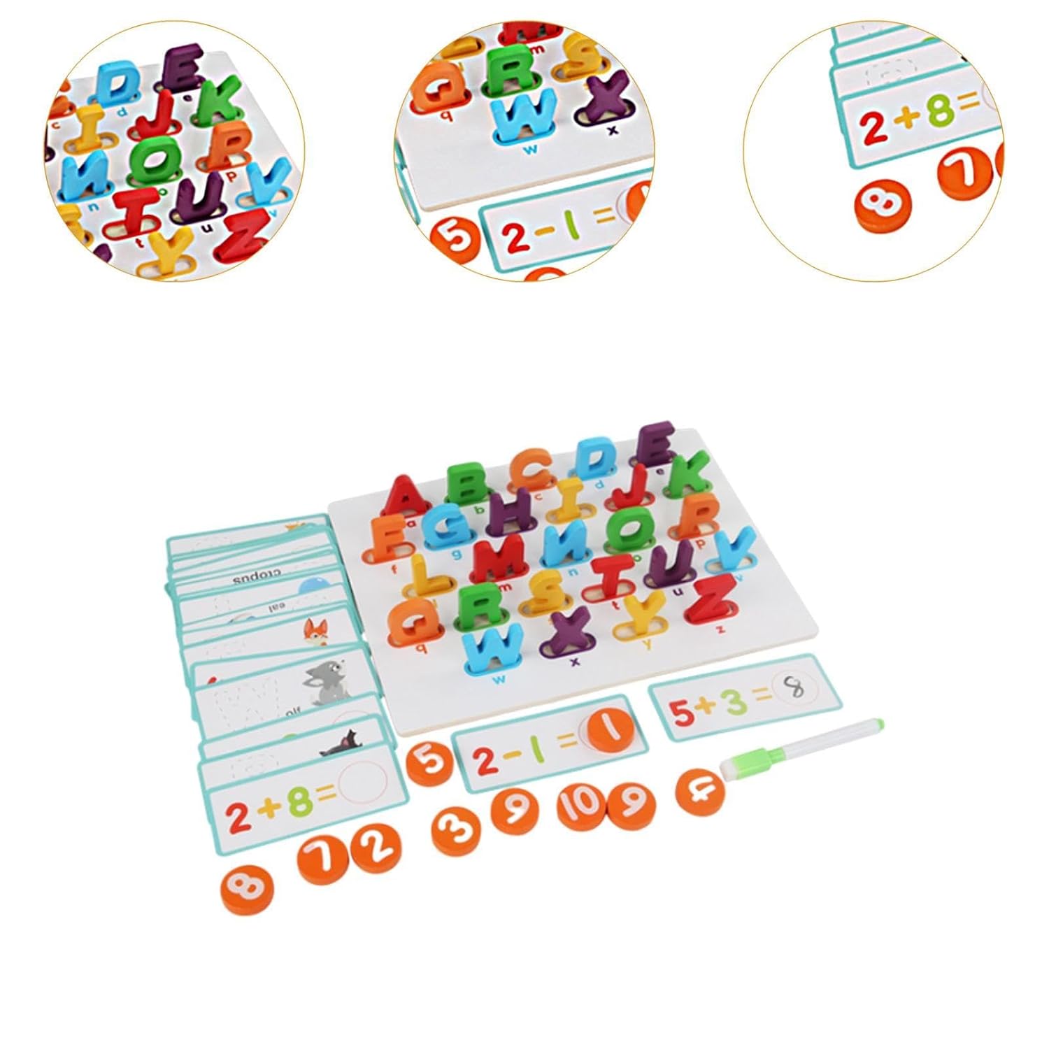 This Wooden Numbers Alphabets Puzzles features arithmetic learning cards for basic addition and subtraction of numbers 1-10. The back of the board is a whiteboard surface that can be used repeatedly for drawing and writing, which develop imagination. The wood alphabet puzzle set includes English letter pairing game. Children can find the corresponding 26 English letters on the baseboard and stand them up, then write the first letters according to the animal patterns. The Wooden Puzzle for Toddlers is very suitable for Montessori number learning, parent child interaction, early education cognitive toys, basic math training, and enlightenment games. This Number and Alphabet Flash Cards aim to cultivate children's interest in mathematics, enhance their cognitive development, fine motor skills, hand eye coordination.