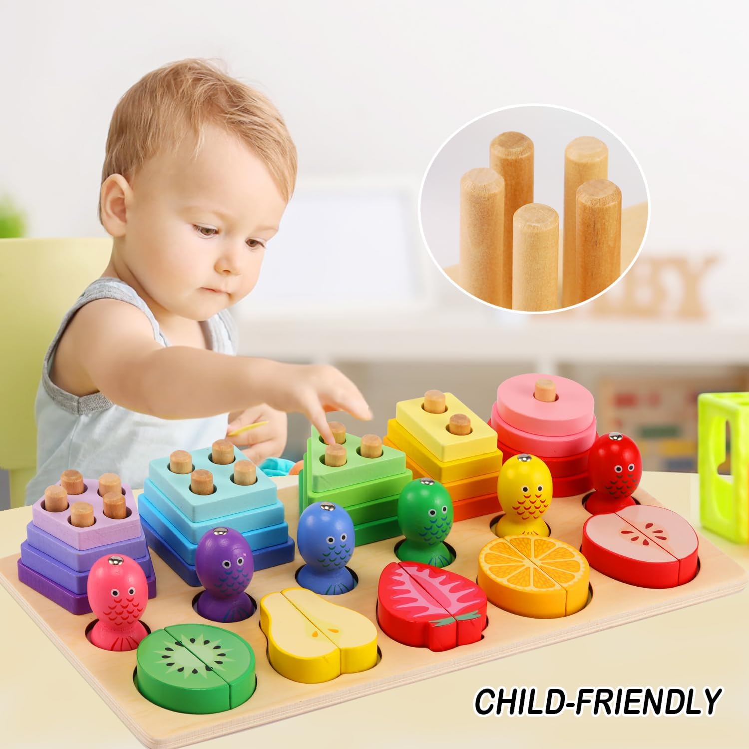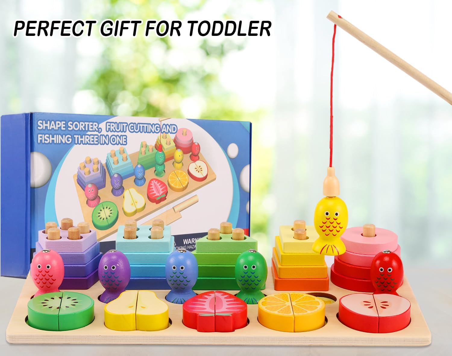 Wooden Shape Sorter, Fruit Cutting & Fishing Three In One