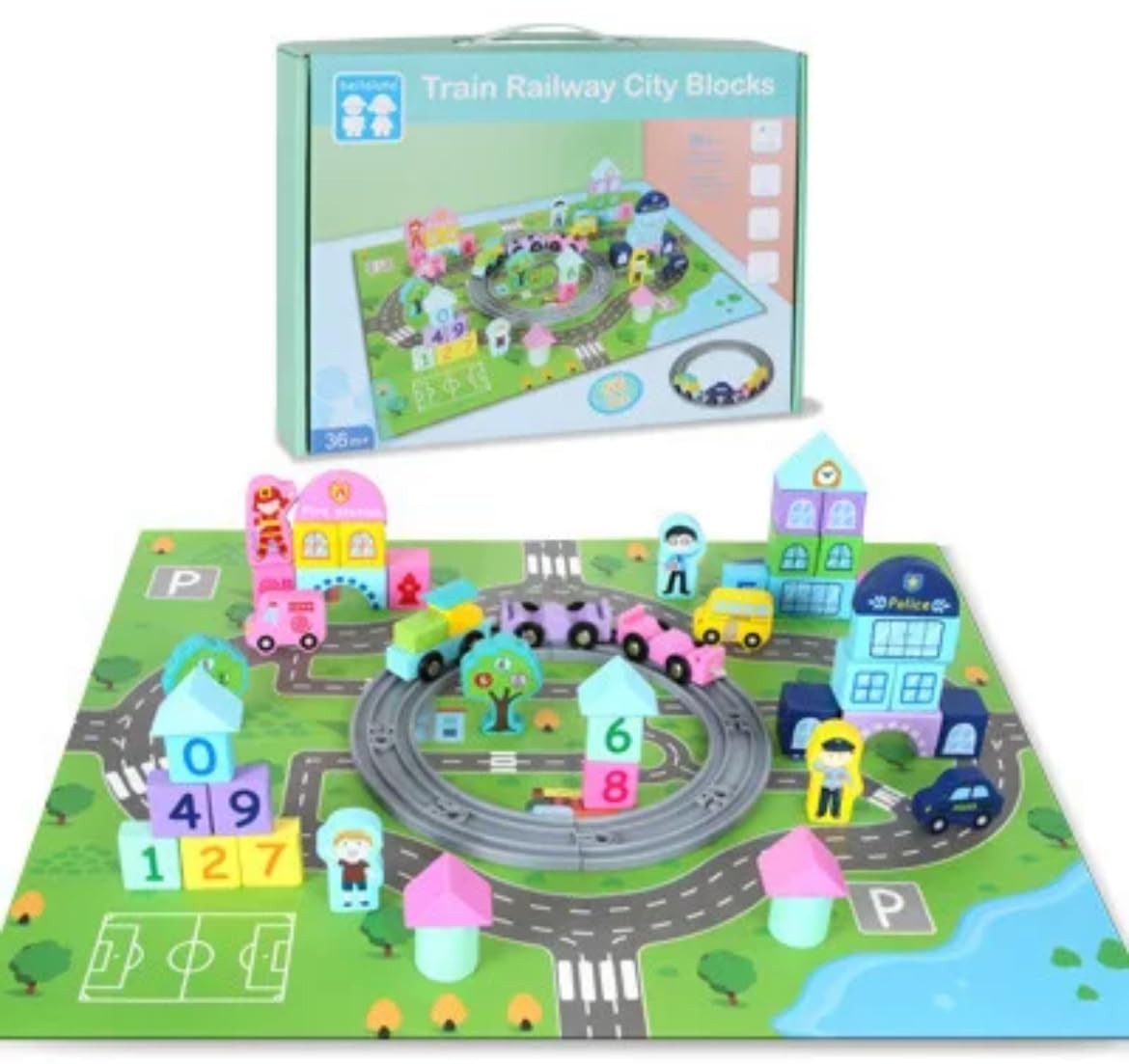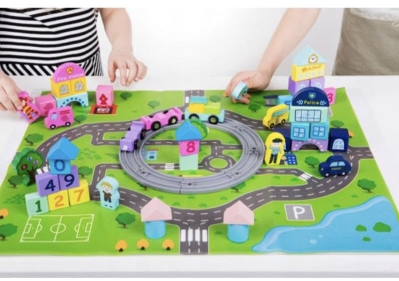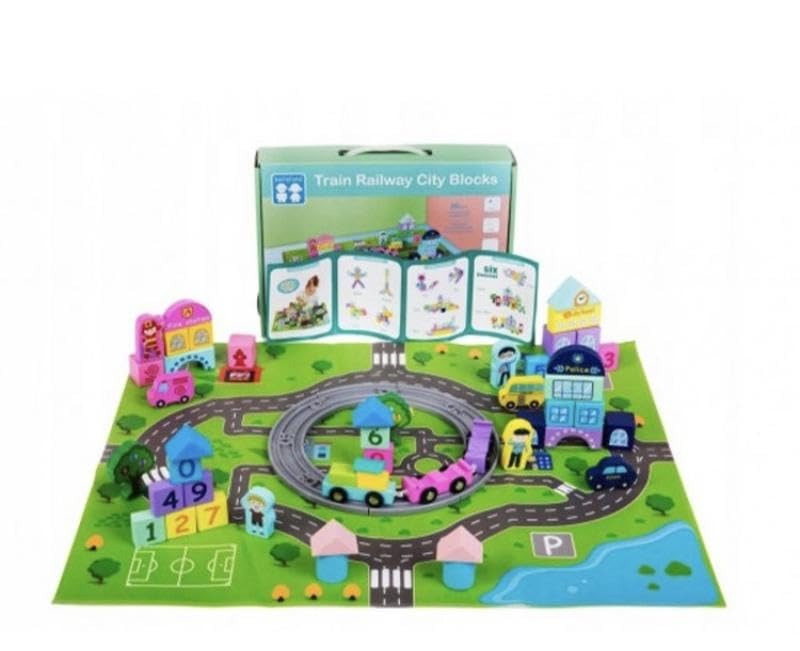 A colorful and educational wooden playset designed for kids aged 36 months and above. This set includes a complete mini city with train tracks, vehicles, buildings, trees, number blocks, and road pieces. Children can build their own imaginative city while learning numbers, improving fine motor skills, and enhancing role-play activities. The wooden components are smooth, child-safe, and painted with non-toxic colors.