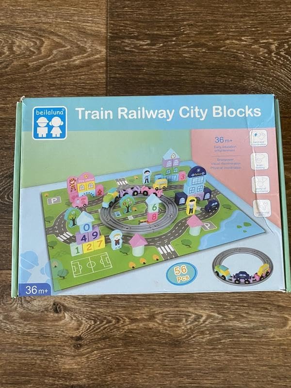 56-piece city railway playset, Wooden train track, Colorful city buildings, Cars, trains & figurines, Number blocks (0–9), Trees, bridges & road signs, Perfect for early education & creativity, Safe for kids 36+ months, Helps motor skills, imagination, counting & color recognition.
